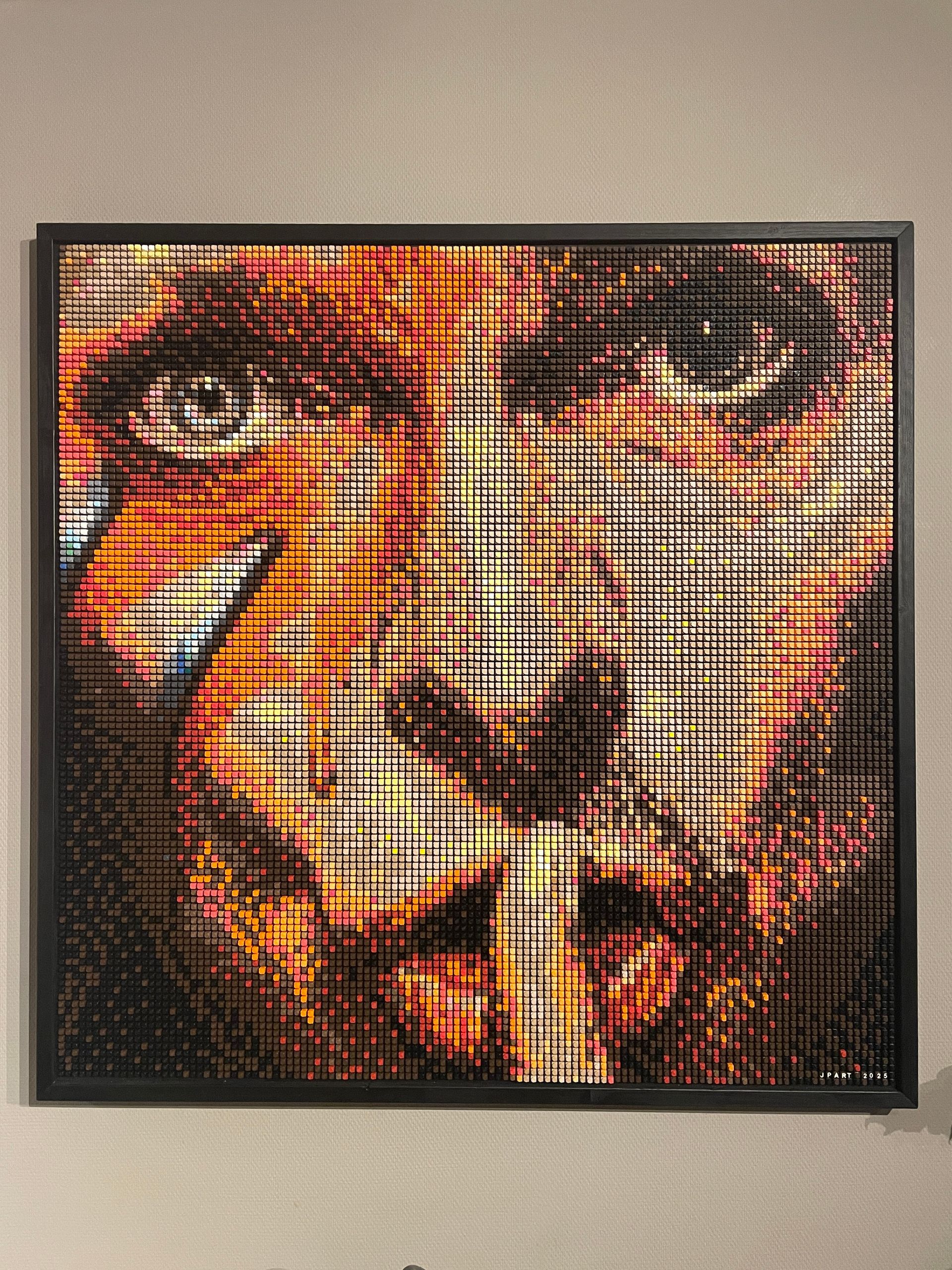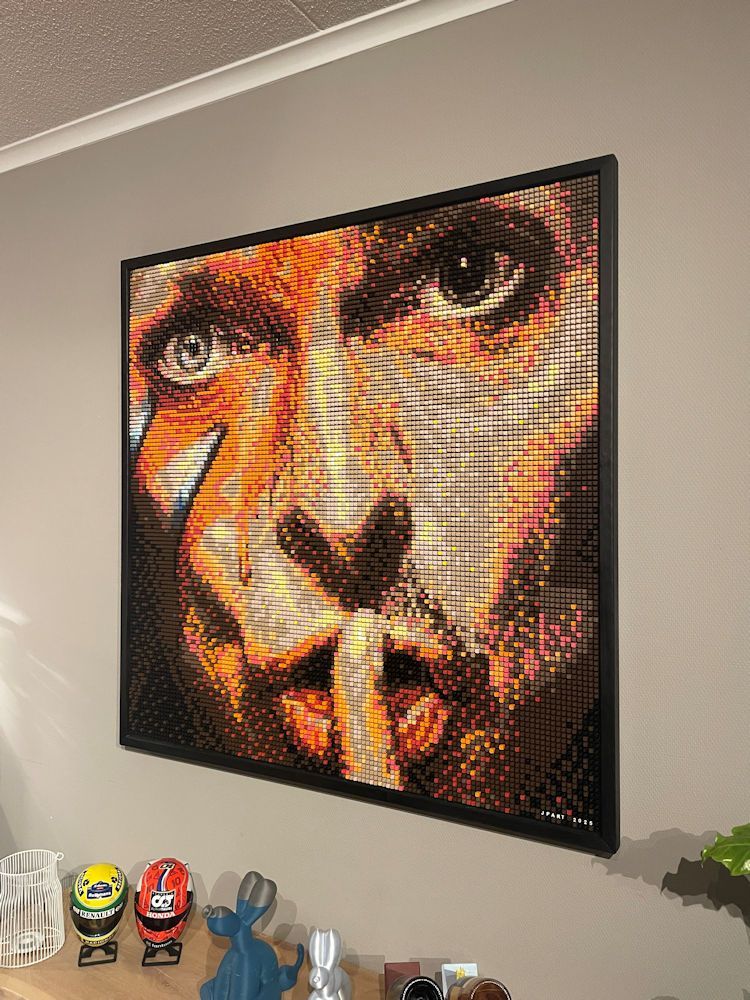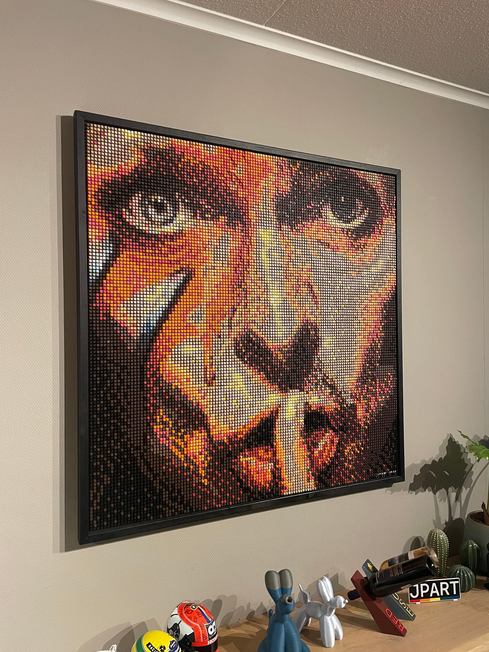 Dit 3D-pixelartkunstwerk van David Bowie is een indrukwekkende ode aan de legendarische artiest, opgebouwd uit 14.400 pixels en uitgevoerd in 27 kleuren. De variatie in kleuren zorgt voor een dynamisch en expressief portret, terwijl de verhoogde pixels een uniek reliëfeffect creëren. Met een afmeting van 125 x 125 cm is het een groots en opvallend werk dat de essentie van Bowie’s karakter perfect weergeeft.